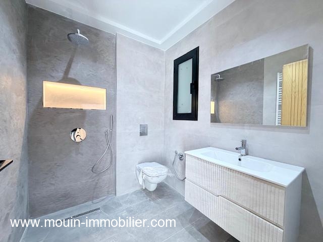 Elle offre au rez de chaussée un spacieux salon – salle à manger ouvert sur un agréable jardin gazonné entourant une belle piscine à cascade, une cuisine moderne installée et une salle d’eau invités.