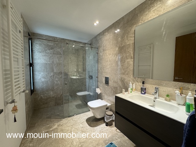 Bâtie en 2018 sur un terrain qui s’étend sur 1000m2 avec une bonne orientation vers le Est, la villa est érigée sur deux niveaux, elle offre au rez de chaussée un spacieux et lumineux salon à double hauteur et avec un coin cheminé (à éthanol) ouvert sur la piscine à travers de grandes baies vitrées, une superbe cuisine de 1,60m de longueur, une petite cuisine d’appuie bien équipée, un séjour, une suite aménagée d’une salle de bain et d’un placard et une salle d’eau invités.