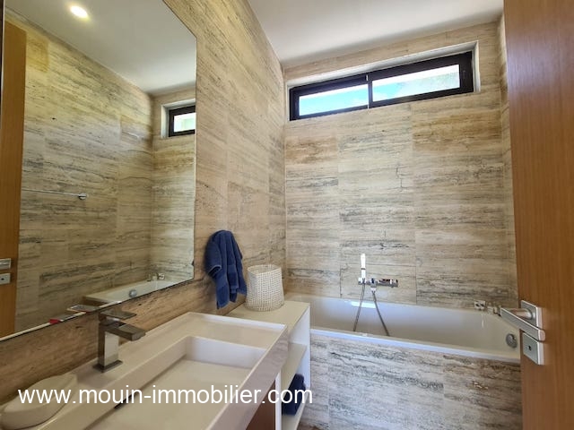 Il se compose au rez-de-chaussée d'un agréable salon avec un coin télé équipé de vidéo projection, une cuisine américaine bien aménagée (ayant des accessoires et électroménagers de marque SMEG) et une salle d'eau.