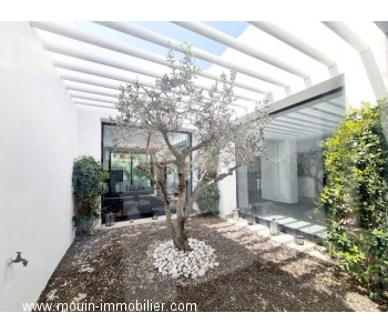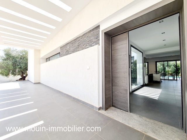 Sur un terrain de 1500m2 et une surface bâtie de 480m2, disponible à la location annuelle une luxueuse demeure de plain pied, richement meublée, située dans un cadre verdoyant et serein à Hammamet. Elle se compose d’un hall d’entrée, un beau salon avec une cheminée et wifi desservant toute la villa, une salle à manger ouvrant sur un beau jardin et la piscine, un vaste jardin d’hiver, une cuisine bien équipée, une salle d’eau visiteurs, quatre suites chacune avec un dressing et salle d’eau dont la suite parentale avec un très grand dressing et salle de bain avec douche et double lavabo.