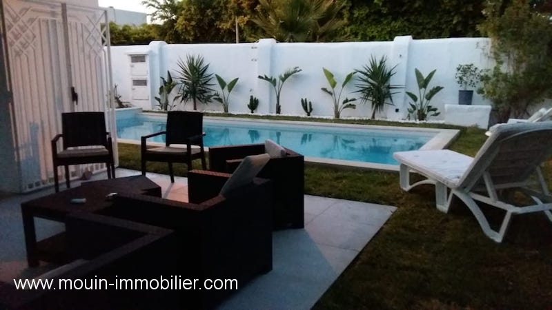 A louer à l'année une charmante villa érigée sur deux niveaux, située à Jinan Hammamet. Le RDC est composé d'un salon spacieux, une salle à manger, une cuisine bien équipée et une terrasse ouverte sur le jardin. Quant à l'étage, il est composé d'une suite, un salon séjour, et un compartiment composé de quatre chambres à coucher, une salle d'eau et une terrasse. Cette villa dispose d'un grand jardin, un parking, une loge pour la femme de ménage avec une salle d'eau. Elle est équipée d’un chauffage central et climatiseur.