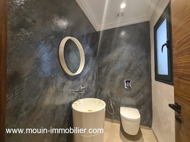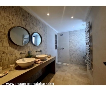 Richement meublée et décoré d’un gout raffiné, la villa est répartie sur deux niveaux et offre au rez de chaussée un espace jour spacieux et bien lumineux répartie en un double salon, une cuisine moderne très bien équipée, une salle d’eau invités et un débarras.