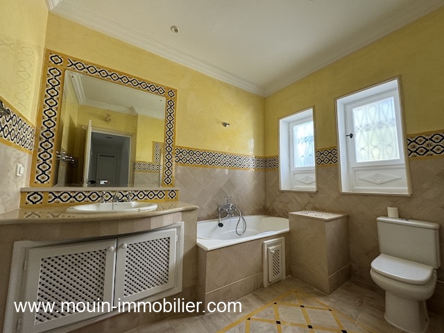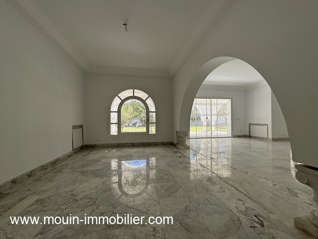 De plain pieds et d’une belle architecture arabesque, la villa offre une partie centrale aménagée en un agréable double salon donnant sur une belle terrasse couverte et un superbe jardin gazonné et planté d’oliviers et de bougainvilliers et une salle à manger.