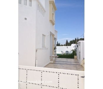 A louer pour des courtes durées, une belle villa avec piscine, jumelée d'un coté et située dans une résidence gardée et sécurisée à la corniche d’Hammamet dans un quartier calme et à quelque pas de la plage.